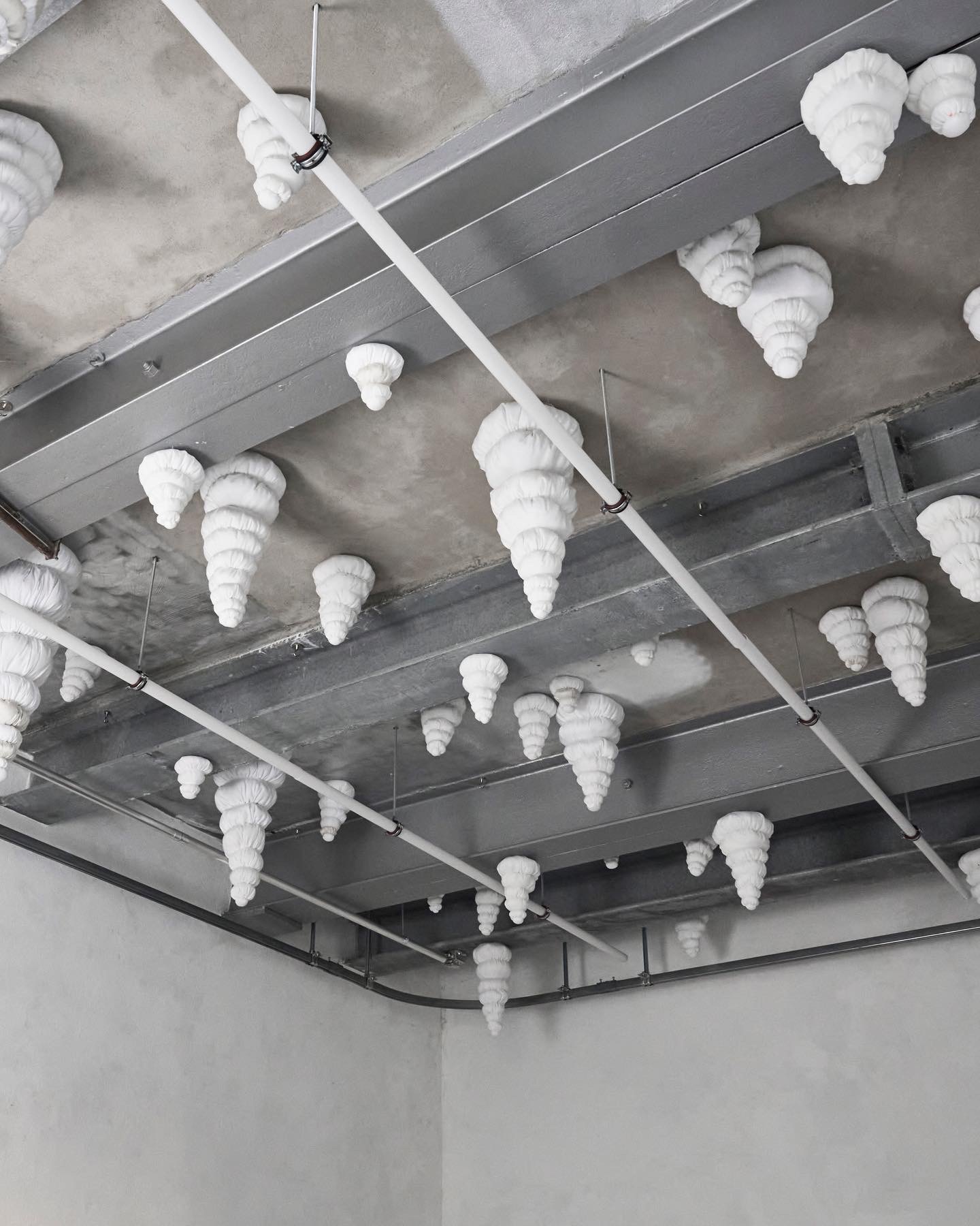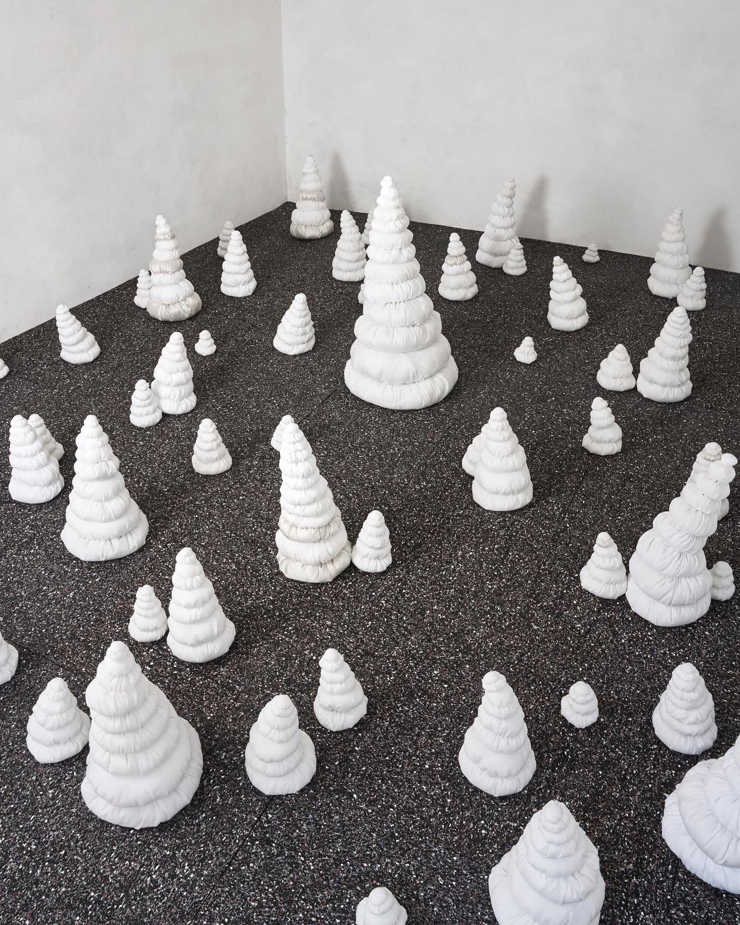 The in-situ installation, 10593, presents 120 meticulously hand-sewn stalagmites and stalactites, forming a cave-like structure that draws viewers into a contemplation of time. The title, 10593, denotes the number of days lived at the time of the artwork’s initial exhibition, embodying a personal measure of time within a larger context.